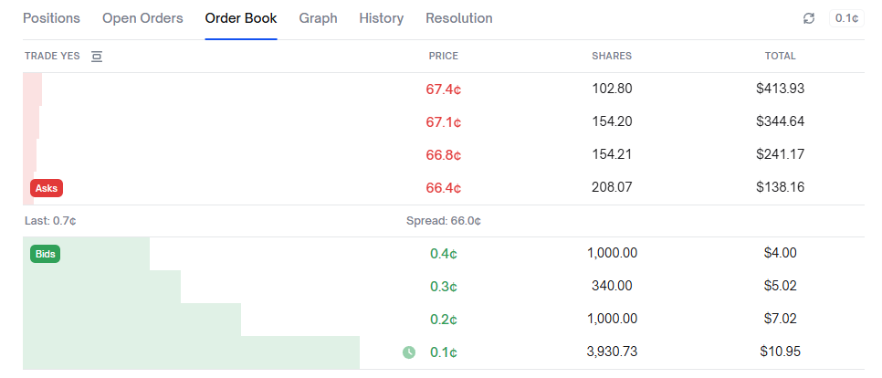0xFFFFFFF mass-places orders to buy 0.1% shares. This is the opposite of the "buy 99%" tail strategy many KOLs share—though this is also a tail strategy, we typically call it the lottery ticket strategy.