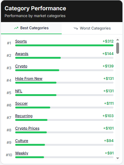 | Tag | Trades | Wins | Win% | | --- | --- | --- | --- | | Sports | 20,554 | 58 | 0.28% | | Recurring | 17,295 | 37 | 0.21% | | Games | 15,176 | 42 | 0.28% | | Crypto | 14,768 | 24 | 0.16% | | Politics | 8,004 | 24 | 0.30% | | Weather | 3,847 | 19 | 0.49% | | Soccer | 3,582 | 14 | 0.39% | | Trump | 3,483 | 11 | 0.32% | | Esports | 2,997 | 8 | 0.27% | | NBA | 2,818 | 7 | 0.25% |